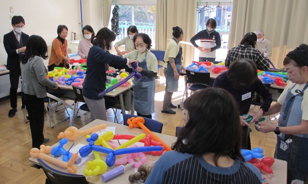 第1部では、ボランティアセンターや市内の施設・コミュニティセンターの依頼を受け、各種イベントでバルーンアートの活動をされているスマイルバルーンの皆様を講師としてお招きしました。細長いカラフルな風船を、キュッキュッとねじっていき、子どもたちに大人気の剣、犬、うさぎ、お花を作って楽しみました。